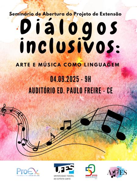 É com grande satisfação gostaríamos de convidá-los para uma apresentação cultural na abertura do Seminário de Abertura do Projeto de Extensão “Arte Educação e Educação Musical – Diálogos com a Educação Inclusiva por meio da Musicoterapia”, que será realizado no dia 04 de setembro de 2025, das 9h às 12h, no Auditório do Edifício Paulo Freire, no Centro de Educação da Universidade Federal do Espírito Santo – UFES.